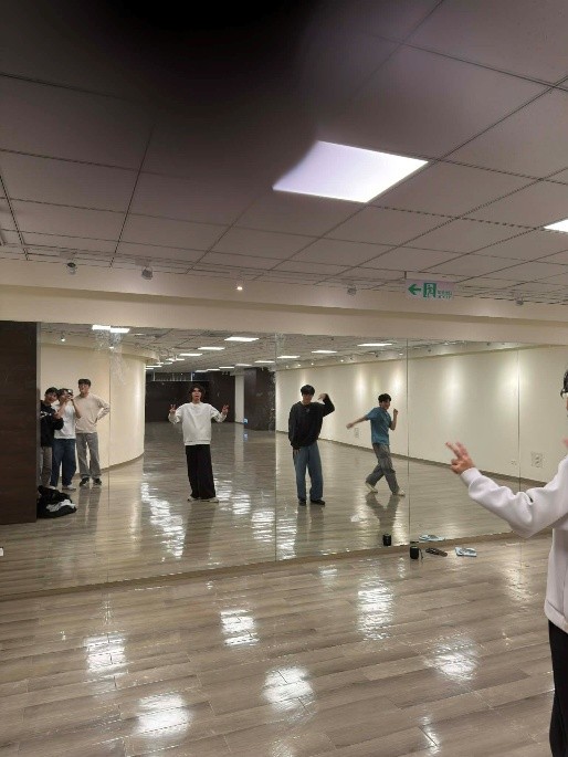 在排練過程中,鏡子往往成為同學們最直接的「老師」。當舞步不整齊時,鏡中的畫面會立即顯示出差異;當動作不夠俐落時,也能從鏡中看到細節的問題。學生們常常會一遍又一遍地對著鏡子練習,反覆調整角度、節奏與動作幅度,直到整體表現達到理想的效果。鏡面讓排練不再只是憑感覺,而是能夠透過視覺回饋進行精準修正。